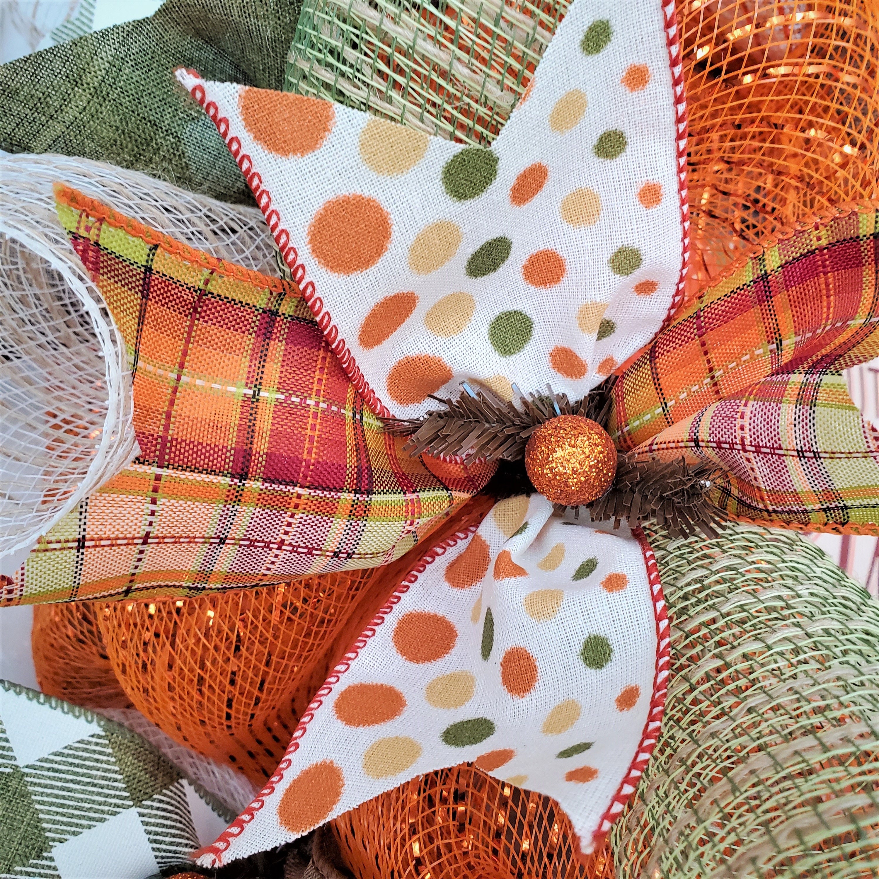 I have designed this wreath around a wood sign with the word Autumn Leaves and Pumpkins please in orange letters framed in an argyle green and brown pattern. I use orange deco mesh as the base color to build the wreath around. There are burlap/white and green/beige deco mesh accents along with premium wired ribbon in colors of brown, green, orange, and white to highlight the colors in the sign. Some of the ribbons have polka dots or plaid design on them.